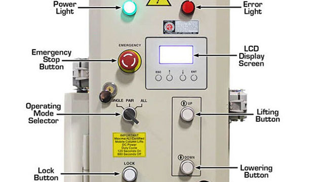 Emergency shut off switches on each column quickly shut off power to the lift in the event an unsafe condition is detected by the operator